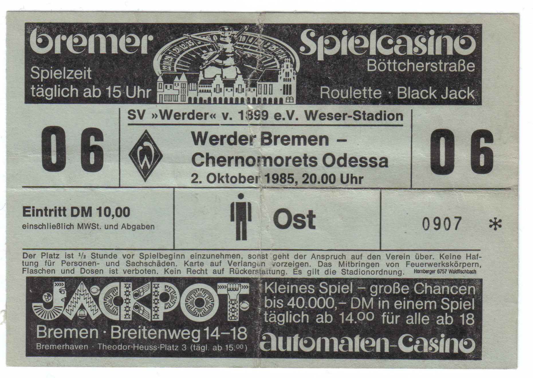 Билет матча 1/32 Кубка УЕФА. 2 октября 1985 г. "Вердер" - "Черноморец"